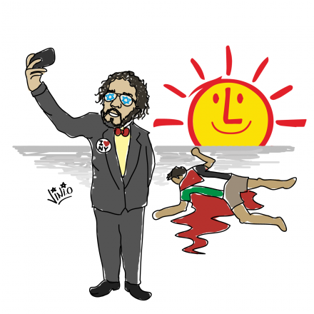 Uma charge feita pelo cartunista brasileiro Vini Oliveira foi compartilhada por usuários de esquerda nas redes sociais e sintetiza o descontentamento de muitos. Nessa imagem, Wyllys, com a Estrela de David estampada em seus óculos, posa para uma selfie em frente a um jovem palestino estirado no chão em cima de uma poça de sangue. Em segundo plano, o sol sorridente, símbolo de seu partido PSOL, brilha à distância (The Intercept obteve permissão para divulgar a imagem).