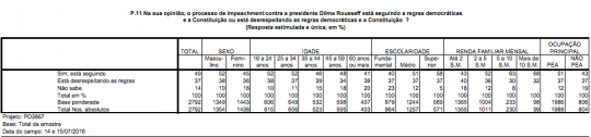 “Na sua opinião, o processo de impeachment contra a presidente Dilma Rousseff está seguindo a regras democráticas e a Constituição ou está desrespeitando as regras democráticas e a Constituição?”