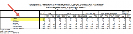 “Uma situação em que poderia haver novas eleições presidenciais no Brasil seria em caso de renúncia de Dilma Rousseff e Michel Temer a seus cargos. Você é a favor ou contra Michel Temer e Dilma Rousseff renunciarem para a convocação de novas eleições para a Presidência da República ainda neste ano?”