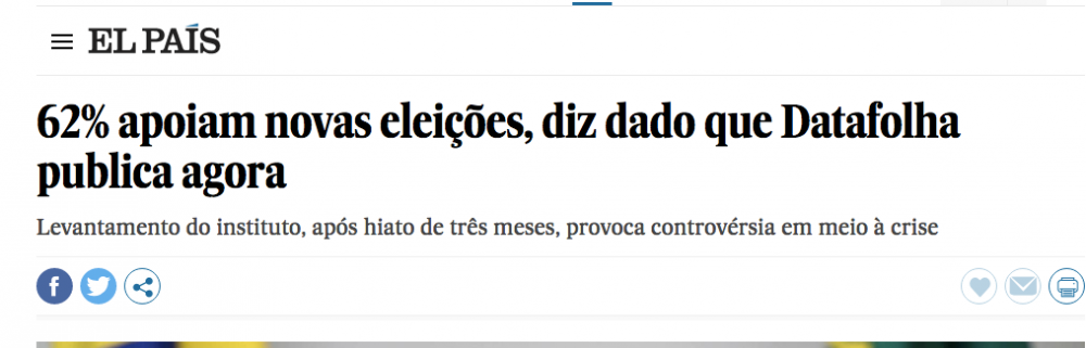 Outros meios de comunicação também consideraram esses dados relevantes. Ontem à noite, a edição brasileira do El País publicou um artigo de destaque com a manchete: “62% apoiam novas eleições, diz dado que Datafolha publica agora”. O El País aborda o ocorrido tanto como um escândalo jornalístico, quanto político, descrevendo como a Folha escondeu esses dados até serem encontrados em consequência de nosso artigo. O jornal também publicou outra matéria citando especialistas que corroboraram as posições de nossos entrevistados, criticando veementemente a Folha pelo uso impróprio dos dados da pesquisa.