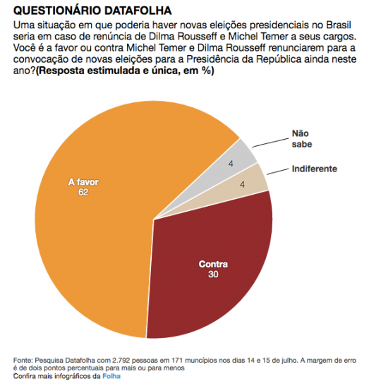 - 62% dos brasileiros querem a renúncia de Dilma e Temer, e a realização de novas eleições: ao contrário dos 3% inicialmente mencionados pela Folha