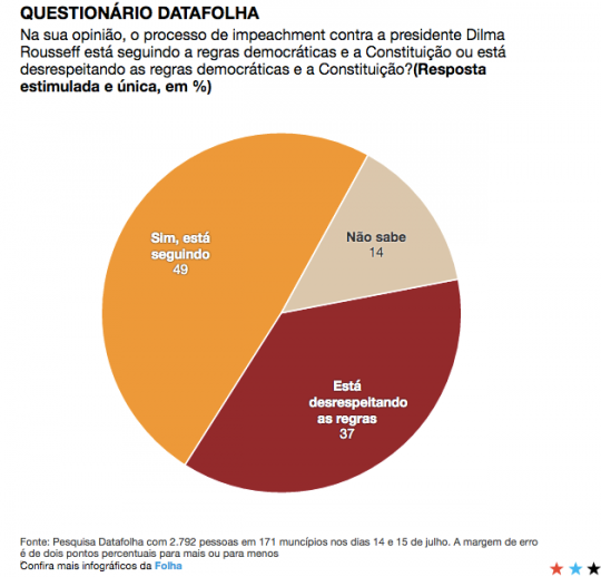 Apenas 49% disseram que o impeachment cumpre as regras democráticas e respeita a Constituição, enquanto 37% disseram que não. Como a Folha pode omitir este dado tão surpreendente e importante quando, supostamente, quer descrever a visão dos eleitores sobre o impeachment?