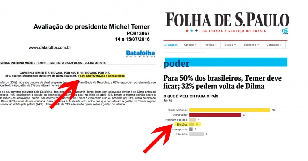 O artigo confirma que, ao contrário de sua afirmação anterior de que apenas 3% dos brasileiros querem novas eleições, “a porcentagem de favoráveis a novas eleições, no entanto, sobe para 62% nas respostas estimuladas, ou seja, quando o instituto pergunta explicitamente”. E incluiu as duas perguntas que havia mantido em segredo: uma demonstrando que a maioria quer a saída de Temer, e outra mostrando uma expressiva minoria que vê o impeachment como uma violação da democracia (a Folha deixou de mencionar que estes novos dados, na verdade, haviam sido publicados anteriormente pelo Tijolaço).