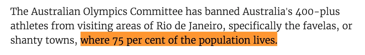 Como a coordenadora de pesquisa de Comunidades Catalisadoras, Cerianne Robertson, observou, o jornal australiano Herald Sun noticiou que 75% da população carioca mora em favela.