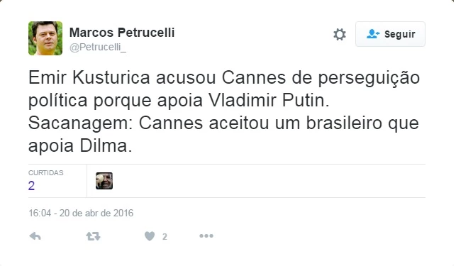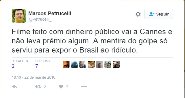 KMF: Sugere mentiras totalmente tristes em relação à equipe. Declarou abertamente que não assistiu ao filme, que estará submetido entre os demais da safra 2016, mas tem gerado um sentimento muito ruim em relação à equipe. Sugere, por exemplo, que a equipe estava no festival em Cannes de férias. Isso, no atual clima político, é uma máquina de gerar ódio e incompreensão. É muito grave.