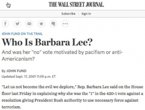 Manchete: “Quem é Barbara Lee? E seu voto de “não” era motivado por pacifismo ou anti-Americanismo?”