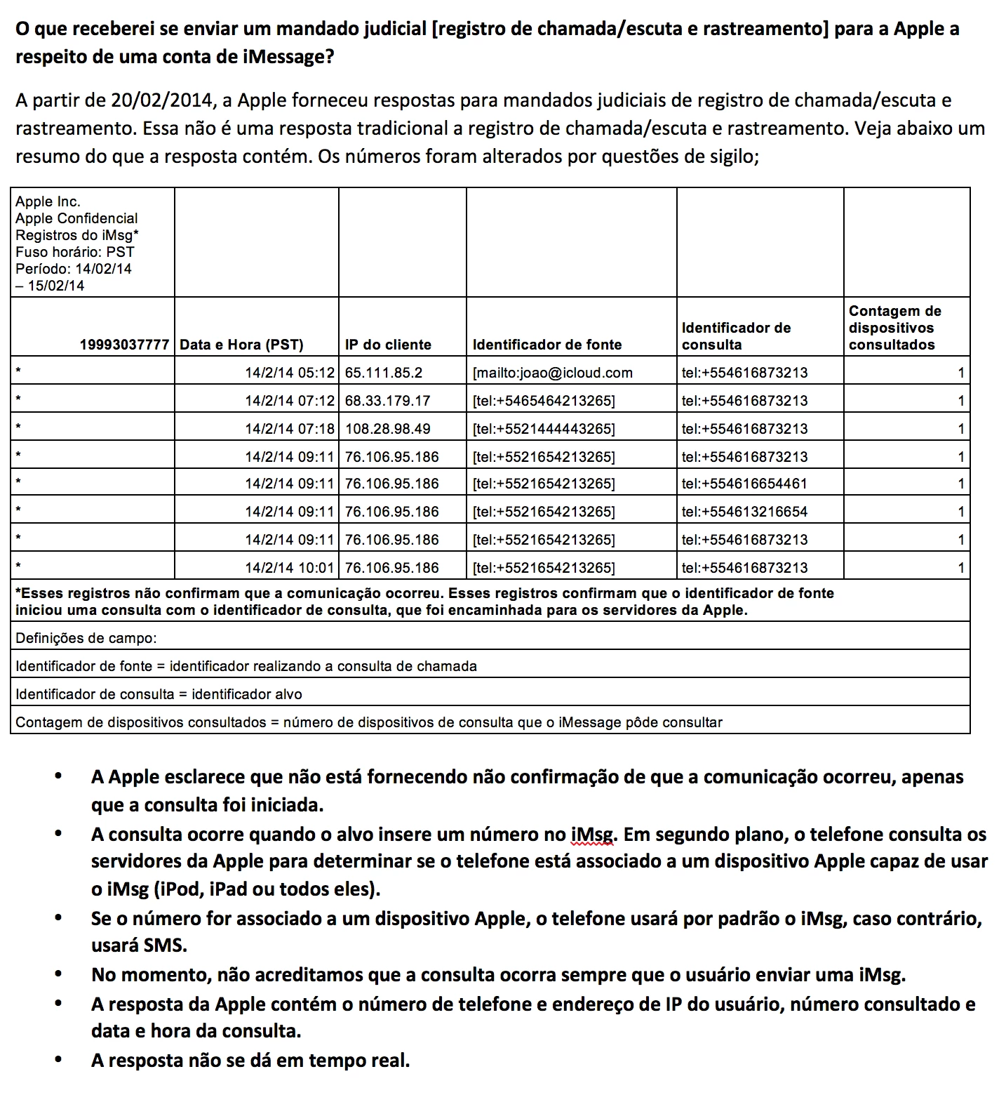 O documento foi escrito com uma linguagem básica, que poderia ser usada para ajudar um parente sem noções de informática, com perguntas como “Como funciona?”, “O iMessage usa meus dados móveis de Internet?” e “O que receberei se enviar um mandado judicial [registro de chamada/escuta e rastreamento] para a Apple para uma conta de iMessage?”: