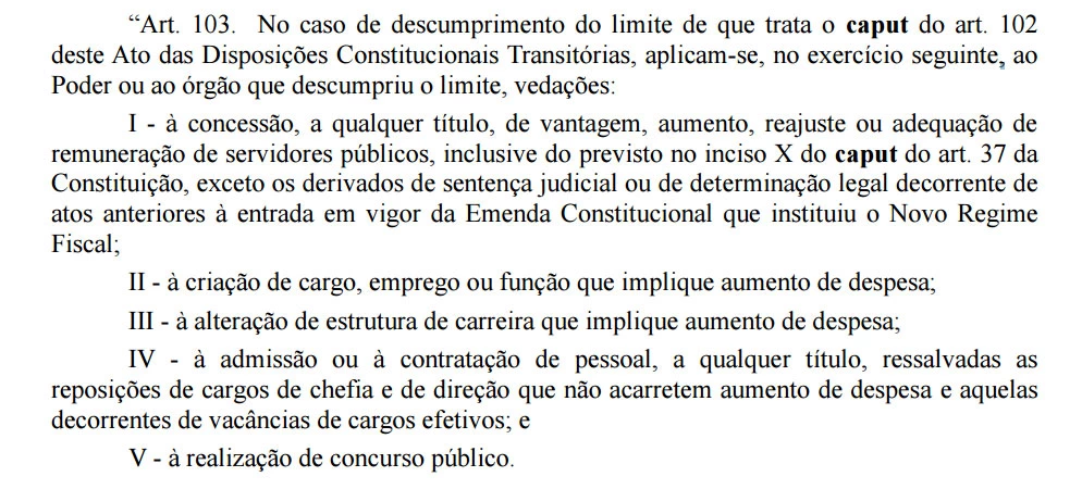Para evitar surpresas desagradáveis, como as novas regras virarem letra morta, caso os limites não sejam respeitados pelo Poder Executivo, o presidente Michel Temer e seus aliados dentro e fora do governo pensaram em punições. Engana-se quem pensa que a punição seja afastar o gestor responsável pelo estouro dos gastos. A proposta é que, se um governante ultrapassar a linha agora definida, os servidores públicos do Executivo (ou de outro Poder, caso o estouro tenha se dado por lá) não receberão nenhum centavo de reajuste salarial (nem reposição de inflação) no ano seguinte. Também fica vetada, pelo ano seguinte, a criação de qualquer novo cargo, mudança em planos de carreira ou a realização de concursos públicos. Não interessa se o estouro se deu em obras de rodovias ou em repasses a mais para a Educação. Quem pagará o pato são servidores e órgãos de todas as áreas do Executivo.
