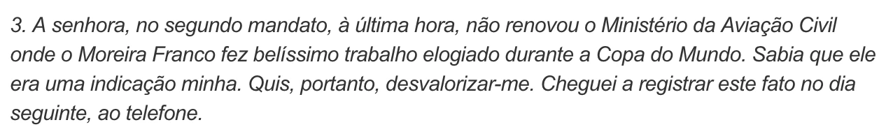 Ele e Michel Temer tornaram-se, num ambiente de muitos amigos da onça, aliados permanentes ao longo dos últimos anos. Uma prova dessa relação de “mexeu com ele, mexeu comigo” foi dada na carta enviada por Temer à então presidente Dilma Rousseff, em dezembro de 2015, na qual reclama, com rancor, da demissão dele do cargo de ministro-chefe da Secretaria de Aviação Civil.