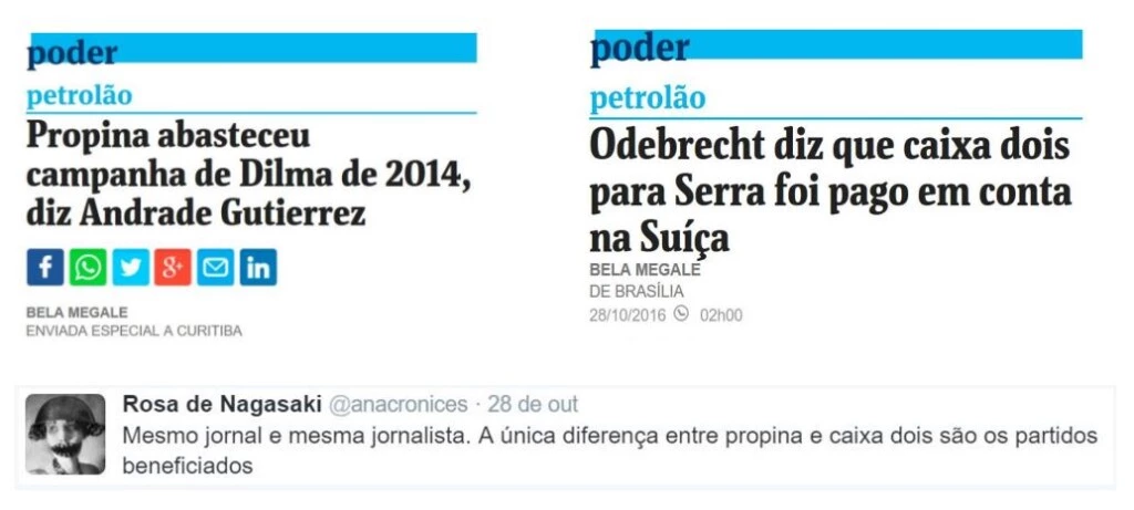Em sua defesa, a Folha pode dizer que, diferentemente da Andrade Gutierrez, a delação da Odebrecht não revelou a existência de nenhuma contrapartida, o que, portanto, não configuraria propina. Isso seria verdade se a própria Folha não tivesse apurado em agosto que houve “propina paga a intermediários de Serra no período em que ele foi governador de São Paulo (de 2007 a 2010) vinculados à construção do trecho sul do Rodoanel Mário Covas.” São as sutilezas da corrupção. Em um tempo em que políticos se mobilizam para conceder anistia a quem cometeu caixa 2, é importante que se faça essa diferenciação dos termos, não é mesmo?