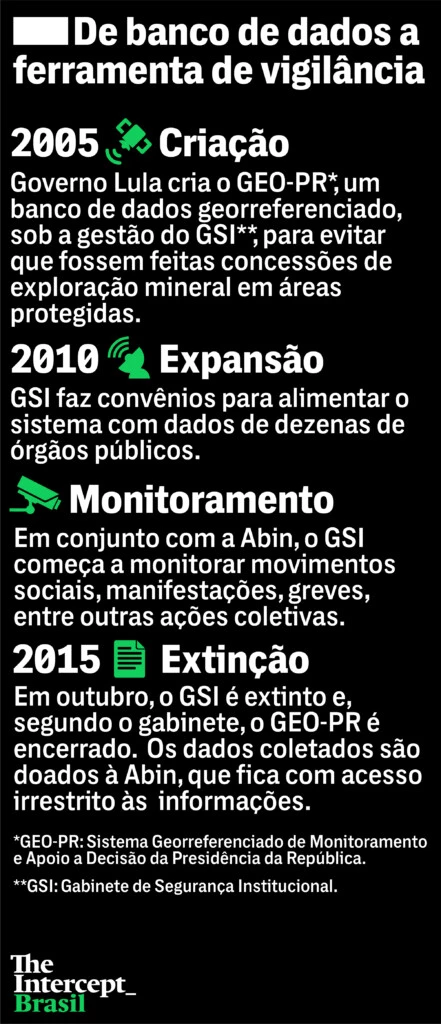 O GEO-PR (sigla de Sistema Georreferenciado de Monitoramento e Apoio à Decisão da Presidência da República) foi instituído pelo governo Lula em 2005 sob a gestão do Gabinete de Segurança Institucional (antiga Casa Militar). O programa não era secreto. Contudo, na época, o GSI não falava publicamente em vigiar greves, manifestações, ONGs ou qualquer outra ação coletiva de setores da sociedade.