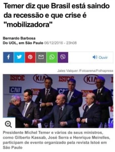 Se o clima no Roda Viva foi de romance, na festa da Isto É foi de paixão. Uma louca paixão. O grande vencedor da noite, escolhido como o Brasileiro do Ano, foi o presidente não-eleito Michel Temer. A partir de misteriosos critérios, a revista elegeu um brasileiro altamente rejeitado pela população, que está envolvido em inúmeros escândalos de corrupção e que pode até sofrer impeachment por ter cometido crime de responsabilidade no caso Geddel.