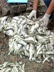 Em abril de 2016, o consórcio da Norte Energia — construtora da Usina de Belo Monte — foi multada em US$ 10,8 milhões pela morte de 16,2 toneladas de peixe. Desde então, mais peixes morreram e pescadores temem que mais ainda morrerão. Foto de celular de um pescador local do rio Xingu documentando a morte de peixes para as autoridades federais.
