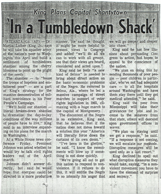 Com a Campanha do Pobres, iniciada em 1968, King intensificou essa campanha, destinada a criar bons empregos, habitação e um padrão de vida decente para todos os americanos. Décadas antes de os manifestantes americanos irem às ruas de Nova York e de outras cidades para “ocupar” o espaço em protesto à desigualdade econômica, King propôs um grande acampamento de barracas em Washington D.C. para exibir medidas contra a pobreza. Veja aqui um artigo da Associated Press sobre a campanha: