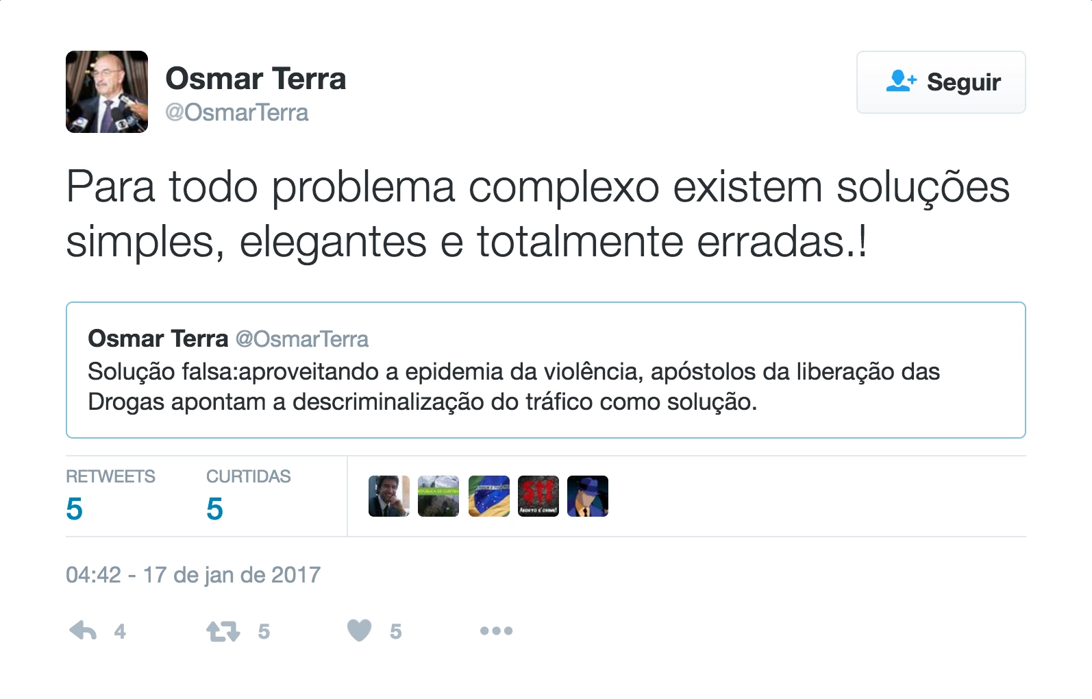 O ex-prefeito de NY ainda se intitula o principal responsável pela redução da criminalidade novaiorquina, ignorando, assim, um declínio nos índices registrados em todo o país naqueles anos (e o fato que dois dos seus programas principais foram abolidos por serem inconstitucionalmente racistas e abusivos). Em sua conta de Twitter, o ministro brasileiro do Desenvolvimento Social também defendeu a “tolerância zero” como “a única política que funcionou nos EUA para reduzir a violência”.