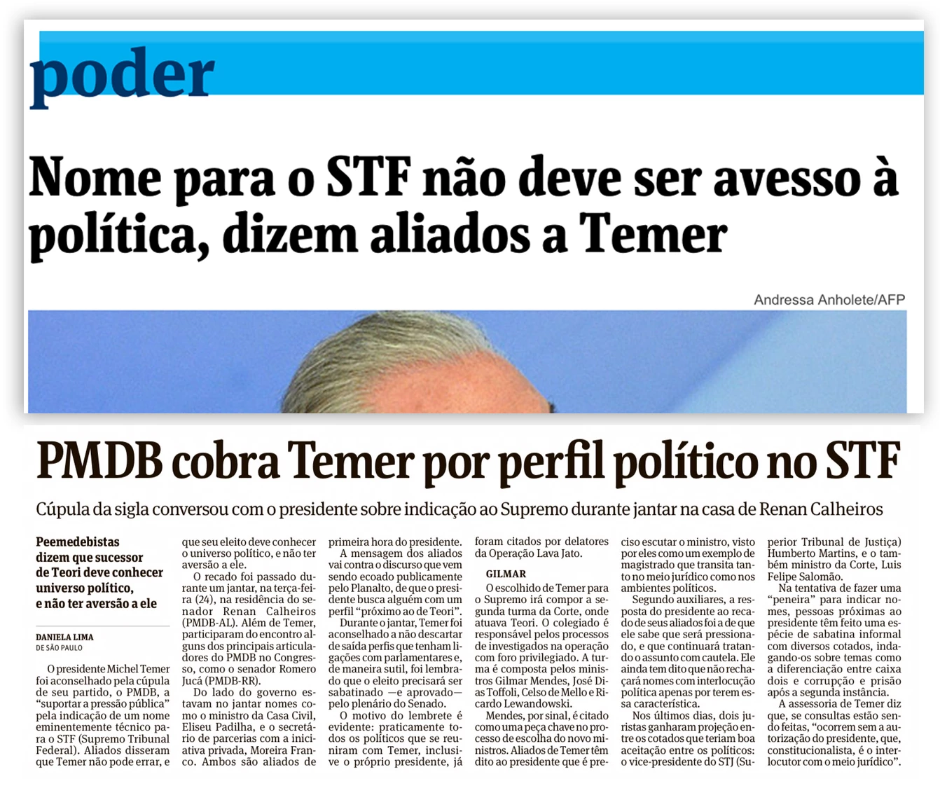 Em um jantar ocorrido semana passada na casa do senador Renan Calheiros, que contou com a presença de Michel Temer, Romero Jucá (líder do governo no Congresso) e Moreira Franco (secretário do PPI), o PMDB cobrou de Temer um nome político para o STF. Notadamente a versão online e impressa da Folha de S. Paulo trazem a mesma informação, mas em tons diferentes. Veja abaixo: