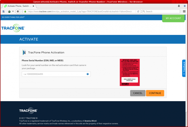 Após adquirir o serviço, é preciso ativar o telefone. Esse processo varia dependendo da operadora. A TracFone exige que você ative seu aparelho ligando para um número de telefone a partir de outro aparelho — obviamente, uma péssima opção para quem está tentando se manter anônimo — ou ativando o aparelho no site da operadora. Eu ativei meu telefone descartável usando o navegador Tor.