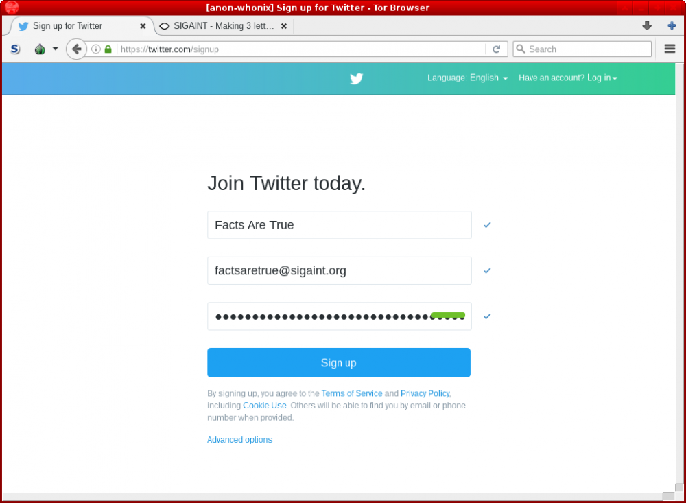 Usando o navegador Tor, visitei https://twitter.com/signup e criei uma conta nova. O formulário de conta nova solicitou meu nome completo (“Facts Are True”), meu endereço de e-mail ([email protected]) e uma senha.