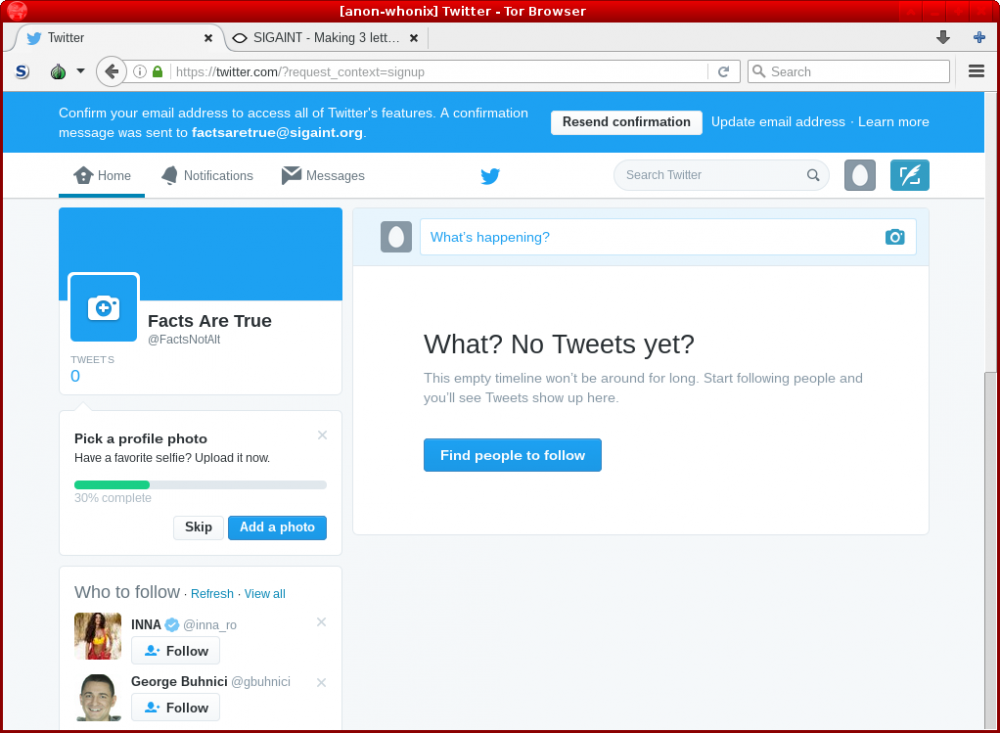 Ao fim do processo de inscrição, o Twitter pede um nome de usuário. Após muitas tentativas, encontrei um que me agradou: @FactsNotAlt. Depois de passar pela tela de boas-vindas, finalmente estava conectado à minha nova conta anônima.