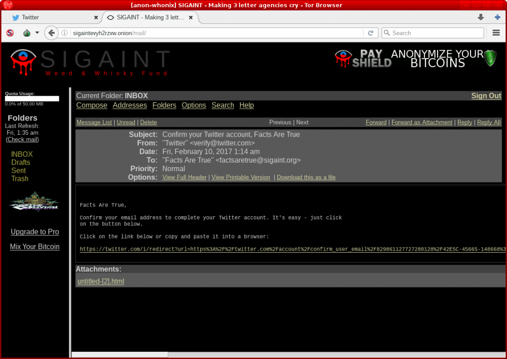 Um desses provedores é o SIGAINT, serviço que funciona apenas na darknet e força todos os usuários a entrarem apenas usando o Tor para ler ou enviar emails. Esse provedor de e-mails é administrado de forma anônima e contém anúncios para sites da darknet (por vezes, extremamente suspeitos). No entanto, você obtém um endereço de e-mail funcional e anônimo.