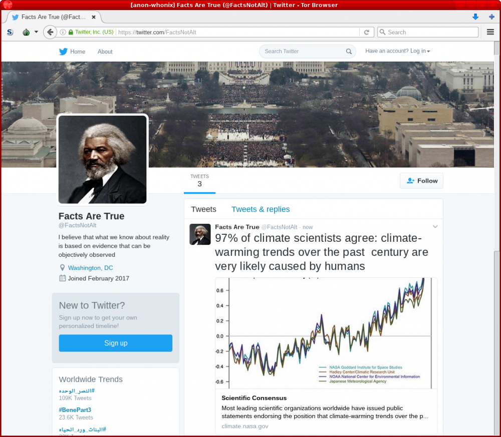 Em resposta, supostos funcionários do governo criaram um onda de contas de Twitter alternativas que compartilham fatos verdadeiros (não confundir com “fatos alternativos”, também conhecidos como “mentiras”) sobre mudanças climáticas e ciência. Em geral, os administradores das contas optaram por se manterem anônimos, temendo represália — mas, dependendo de como eles criaram e usam as contas, eles não estão necessariamente anônimos para o Twitter ou para quem o Twitter compartilha seus dados.