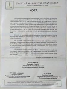 “Nada justifica a liberação do aborto até o terceiro mês, quando os direitos do nascituro estão salvaguardados desde a concepção pelo ordenamento jurídico brasileiro”, alegam os parlamentares cristãos, em nota.