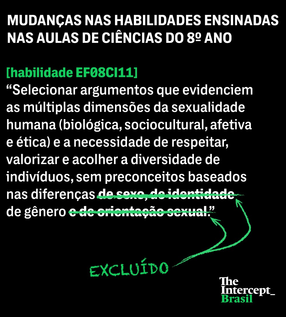 O Ministério da Educação (MEC) cortou a homofobia da lista de preconceitos que devem ser combatidos com a educação, alterando um documento que já havia sido entregue à imprensa. Na quinta-feira, 6, a nova versão da Base Nacional Comum Curricular, uma orientação do que as escolas públicas e particulares brasileiras devem ensinar em sala, foi divulgada. Dois dias antes, o texto foi enviado pelo MEC à imprensa. A publicação de matérias, no entanto, era liberada apenas no dia 6, quando o documento seria oficialmente entregue ao Conselho Nacional de Educação, órgão responsável pelos próximos passos do processo de instituição da base.