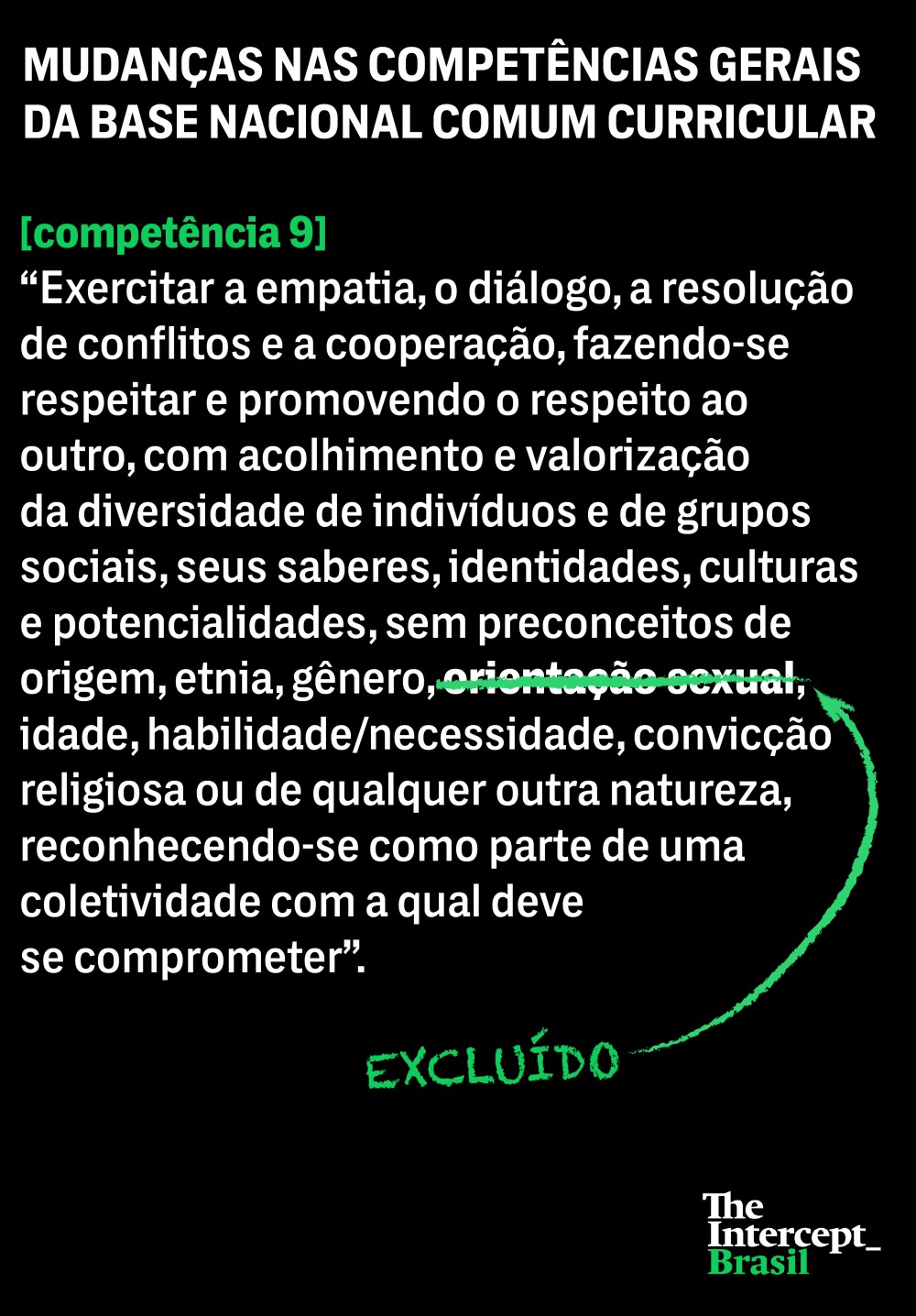 A versão entregue ao Conselho Nacional de Educação contém mudanças cirúrgicas: os fragmentos que defendiam o respeito à diversidade tiveram os termos “identidade de” gênero e “orientação sexual” sumariamente apagados.