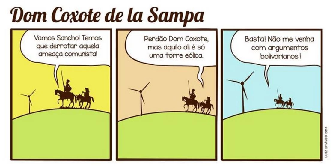O Ibope fez uma pesquisa em 2010 e outra em 2016 para medir o conservadorismo do brasileiro. Nesse período, a quantidade de pessoas que apoiam a redução da maioridade penal saltou de 63% para 78%. Os apoiadores da prisão perpétua subiram de 68% para 78%. O apoio a penas de morte pulou de 31% para 49%. Os que são contra a legalização do aborto continuaram no mesmo patamar: 78%. Bandeiras identificadas com a esquerda nunca estiveram tão impopulares. A tal histórica doutrinação marxista nas escolas tem sido tão incompetente que tem feito o país ficar ainda mais conservador. Vejam só o tamanho da insanidade dos patrulheiros! Holiday lembra Dom Quixote, ou melhor, Dom Coxote.