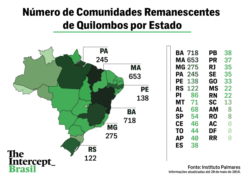 Passados 129 anos desde a abolição da escravatura, os quilombos continuam sendo locais necessários à resistência da população negra. A ancestralidade negra vira combustível para a luta atual contra o racismo e pelo direito à terra – ameaçado ainda mais pelo governo Michel Temer, que paralisou as demarcações das terras quilombolas. O reconhecimento das comunidades remanescentes de quilombos é uma forma de reparar os danos do período escravagista sentidos ainda hoje. O Brasil tem cerca de 3 mil comunidades quilombolas.