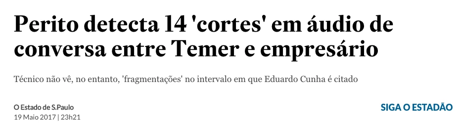 A polêmica do momento sobre a gravação da conversa entre o presidente Michel Temer e o ruralista Joesley Batista é a possibilidade de adulteração do áudio. Grandes jornais contrataram peritos que, 24 horas após a liberação do áudio, já tinham batido o martelo não apenas sobre o fato de haver edições, mas inclusive sobre quantas seriam: são um total exato de 50, ou de 14, ou nenhuma… Tudo depende do jornal que se estiver lendo. Temer, é claro, usou o maior número noticiado em seu pronunciamento de sábado.