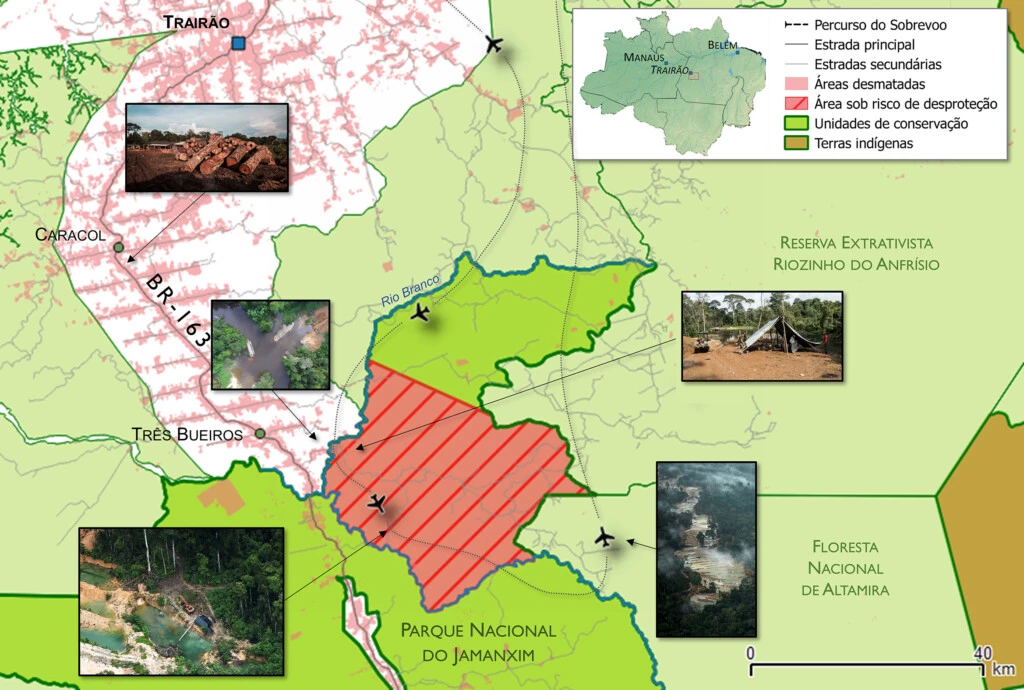 Na região que visitamos, no sudoeste do Pará, pretende-se a redução do Parque do Jamanxim e a criação, no lugar, da APA Rio Branco. Entretanto, não encontramos nada que justificasse a mudança. Ao contrário. Não há uma única ocupação efetiva, com morador, roça ou qualquer indício da presença de qualquer posseiro. Por outro lado, a área está permeada de grandes garimpos ilegais e ramais madeireiros. Esses seriam os grandes beneficiários da recategorização da UC, além da grilagem que controla a região.