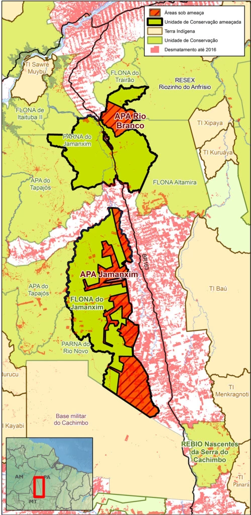No final de 2016, entretanto, o governo federal, muito “generosamente”, editou as Medidas Provisórias (MP) 756 e 758, que determinam, entre outras alterações, a redução do Parque do Jamanxim e a alteração de parte da Floresta Nacional do Jamanxim para a categoria de Área de Proteção Ambiental (APA). Na prática, trata-se de um ato que retira proteção da área, uma vez que a APA é um tipo de UC pouco restritiva – as terras podem ser privatizadas, e o Estado pode autorizar desmatamento e a garimpagem em seu interior.
