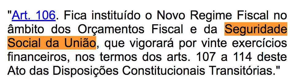 Trecho da Emenda Constitucional 95, que determina o congelamento do orçamento da Seguridade Social por 20 anos.