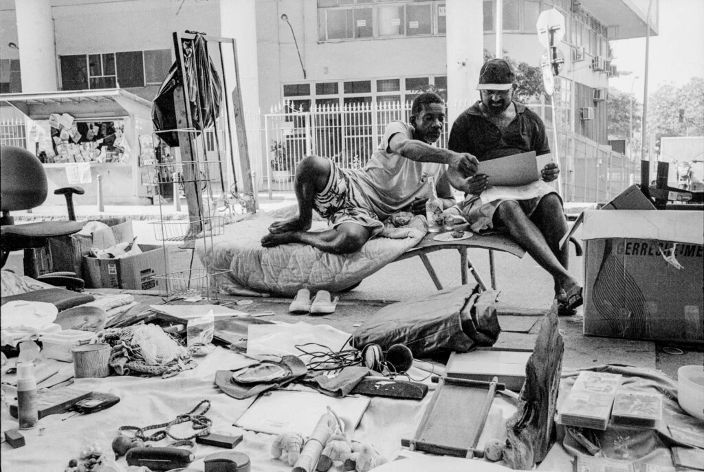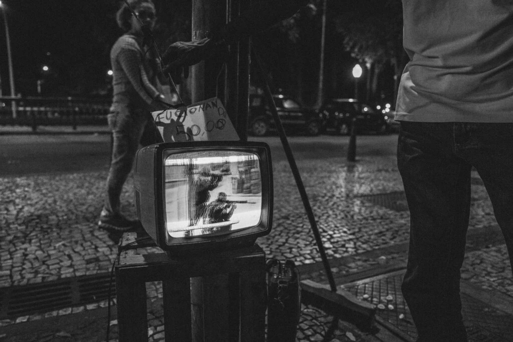 Moradores de rua assistem tiroteio em Copacabana ao vivo em TV encontrada no lixo e disponibilizada para venda no shopping chão.