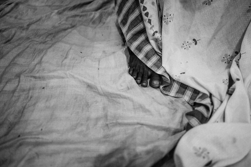 Detalhe do pé de pessoa em situação de rua enquanto esperava à chegada de um “sopão” trazido por voluntários.