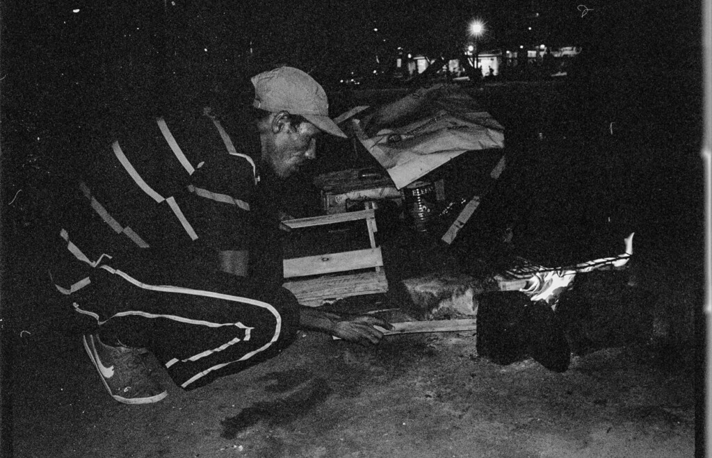 Rapaz em situação de rua com sua cadelinha prenha antes de dormir na Glória.
