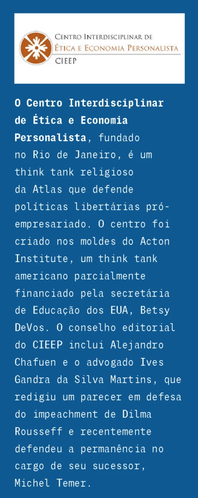 Chafuen se animou com a eleição de Donald Trump para a presidência dos EUA. Ele é só elogios para a equipe do presidente. O que não é nenhuma surpresa, pois o governo Trump está cheio de amigos e membros de grupos ligados à Atlas. Sebastian Gorka, o islamofóbico assessor de contraterrorismo de Trump, dirigiu um think tank patrocinado pela Atlas na Hungria. O vice-presidente Mike Pence compareceu a um encontro da Atlas e teceu elogios ao grupo. A secretária de Educação Betsy DeVos trabalhou com Chafuen no Acton Institute, um think tank de Michigan que usa argumentos religiosos a favor das políticas libertárias – e que agora tem uma entidade subsidiária no Brasil, o Centro Interdisciplinar de Ética e Economia Personalista.