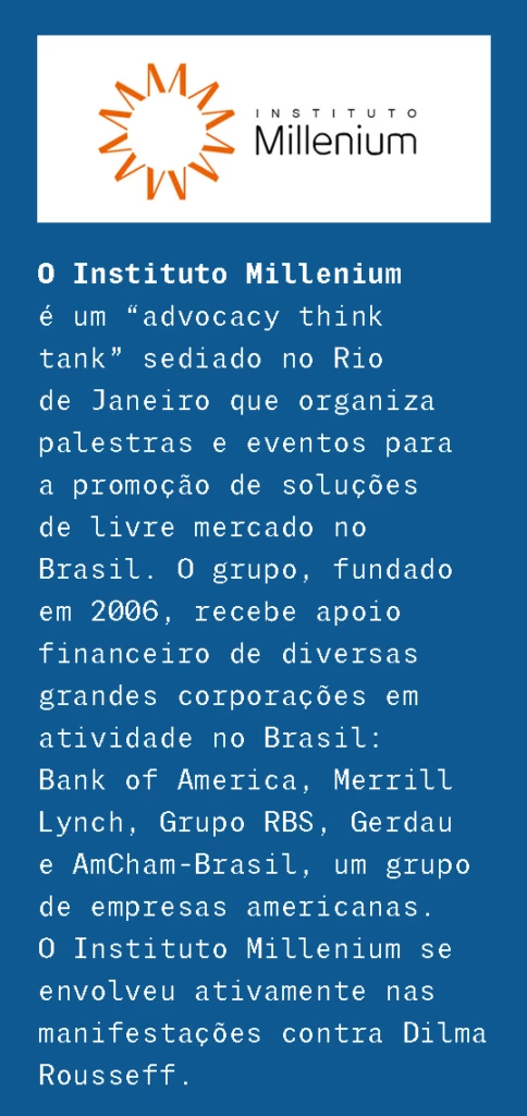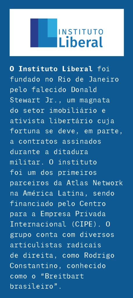 Em nenhum outro lugar a estratégia da Atlas foi tão bem sintetizada quanto na recém-formada rede brasileira de think tanks de defesa do livre mercado. Os novos institutos trabalham juntos para fomentar o descontentamento com as políticas socialistas; alguns criam centros acadêmicos enquanto outros treinam ativistas e travam uma guerra constante contra as ideias de esquerda na mídia brasileira.