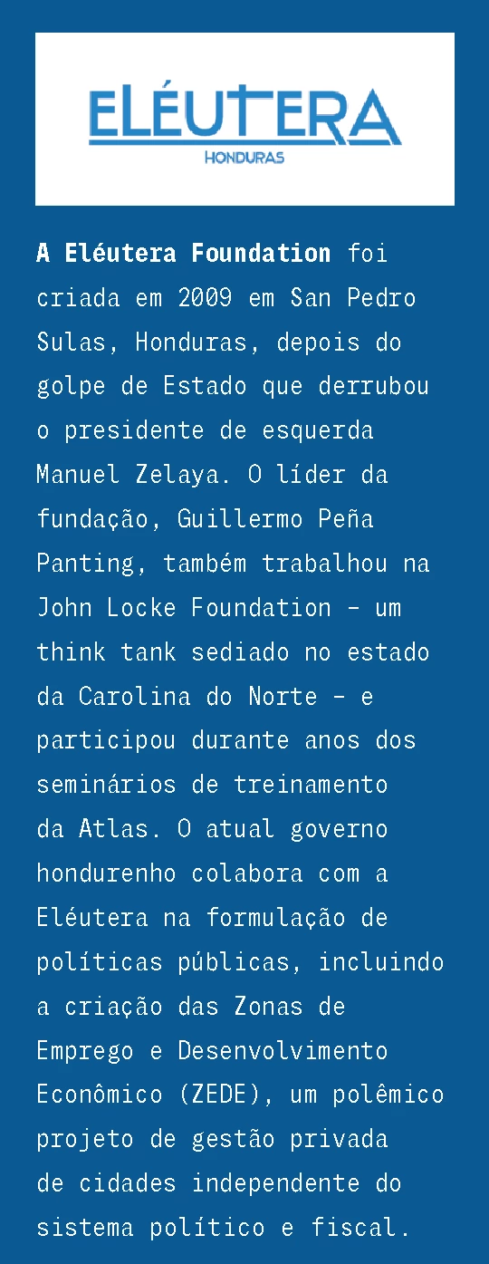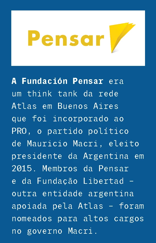 Ao longo dos anos, a Atlas e suas fundações caritativas associadas realizaram centenas de doações para think tanks conservadores e defensores do livre mercado na América Latina, inclusive a rede que apoiou o Movimento Brasil Livre (MBL) e organizações que participaram da ofensiva libertária na Argentina, como a Fundação Pensar, um think tank da Atlas que se incorporou ao partido criado por Mauricio Macri, um homem de negócios e atual presidente do país. Os líderes do MBL e o fundador da Fundação Eléutera – um think tank neoliberal extremamente influente no cenário pós-golpe hondurenho – receberam financiamento da Atlas e fazem parte da nova geração de atores políticos que já passaram pelos seus seminários de treinamento.