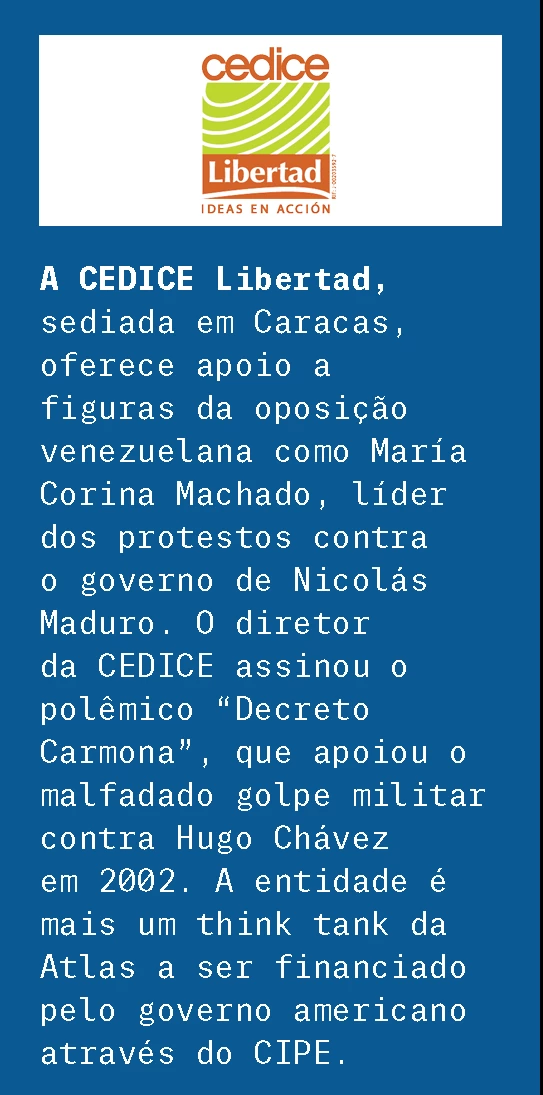 Em 1998, a CEDICE Libertad – principal organização afiliada à Atlas em Caracas, capital da Venezuela – já recebia apoio financeiro do Center for International Private Enterprise (Centro para a Empresa Privada Internacional – CIPE). Em uma carta de financiamento do NED, os recursos são descritos como uma ajuda para “a mudança de governo”. O diretor da CEDICE foi um dos signatários do controverso “Decreto Carmona” em apoio ao malsucedido golpe militar contra Chávez em 2002.