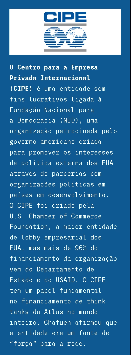 No entanto, a Atlas acabou conseguindo canalizar os fundos que vinham do NED e do CIPE, transformando o dinheiro do contribuinte americano em uma importante fonte de financiamento para uma rede cada vez maior. Os recursos ajudavam a manter think tanks na Europa do Leste, após a queda da União Soviética, e, mais tarde, para promover os interesses dos EUA no Oriente Médio. Entre os beneficiados com dinheiro do CIPE está a CEDICE Libertad, a entidade a que líder opositora venezuelana María Corina Machado fez questão de agradecer.