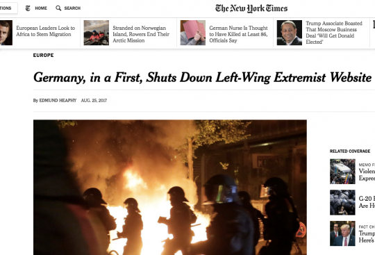 Manchete do New York Times: “Em medida inédita, Alemanha bloqueia site extremista de esquerda”.