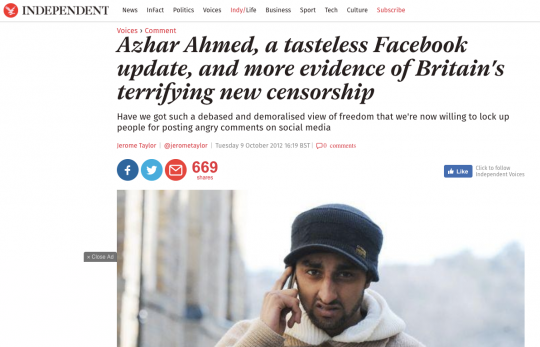 “Azhar Ahmed, uma publicação de mau gosto no Facebook e mais indícios da nova e aterrorizante face da censura na Grã-Bretanha”