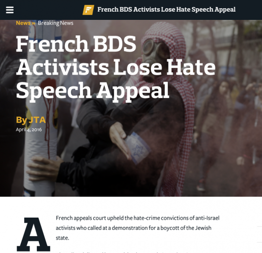 “Rejeitado o recurso de ativistas franceses de BDS [Boicote, Desinvestimento e Sanções a Israel] em caso de discurso de ódio”. “Um tribunal de apelação mantém condenação por crime de ódio de ativistas anti-Israel que defenderam boicote ao Estado judeu durante uma manifestação”.