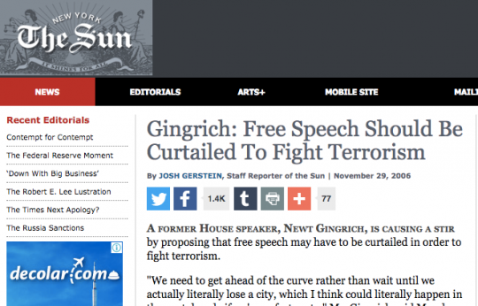O ex-presidente da Câmara dos Representantes dos EUA alegou que os radicais islâmicos não acreditam na Constituição nem na liberdade de expressão, e que os EUA deveriam, portanto, “usar toda a tecnologia possível para acabar com sua capacidade de acessar a internet e de se valer da liberdade de expressão, para perseguir aqueles que querem nos matar, para impedir que continuem recrutando mais pessoas”. Em um artigo em defesa da sua posição, Gingrich argumenta que “não deveria ser aceitável usar a liberdade de expressão como proteção para pessoas que planejam matar outras pessoas, que, por sua vez, possuem seus próprios direitos inalienáveis”. Acrescenta ainda que “o fato é que nem todo tipo de discurso é permitido à luz da Constituição”.