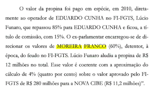 Ainda segundo o documento, esse repasse incomodou Eduardo Cunha e foi o motivo de um racha que levou à substituição de Franco na Caixa por um indicado do ex-presidente da Câmara.