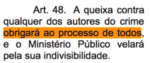 Ele se refere ao artigo 48 do Código de Processo Penal, que diz que todos os envolvidos em um mesmo crime devem ser julgados no mesmo processo: