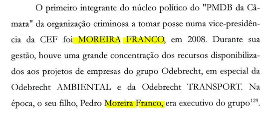 Moreira Franco é apontado como o nome por trás dos favorecimentos de empréstimos da Caixa Econômica, onde atuou como vice-presidente entre 2007 e 2010. O documento do Ministério Público lembra que, em 2008, foi aprovado um financiamento de R$ 3,2 bilhões ao consórcio da Hidrelétrica Santo Antônio, formado, entre outras empresas, pela Odebrecht — empresa na qual o filho de Moreira Franco trabalhava.