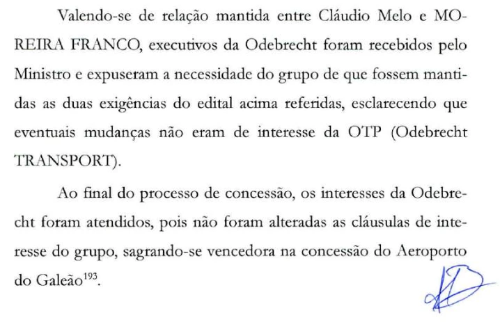 A denúncia também menciona favorecimento à Odebrecht na concessão do Aeroporto Galeão, no Rio. Moreira Franco chefiou a Secretaria de Aviação Civil, órgão responsável pela decisão, de março de 2013 a janeiro de 2015.